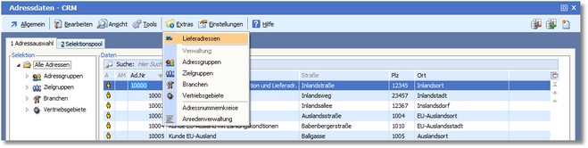 1. Klicken Sie mit der Maus im Adresstamm auf "Extras > Lieferadressen".