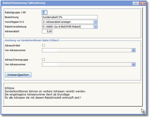 Der hier hinterlegte Adressrabatt wird bei Zuordnung dieser Rabattgruppe innerhalb des Adressstammes übernommen und kann für die gewählte Adresse abweichend zu dem hier definierten Rabattsatz geändert werden.