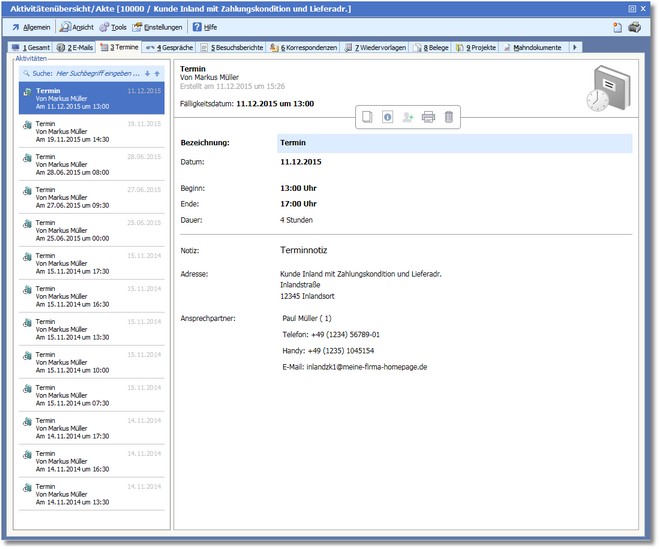 Mit dem Kunden durchgeführte oder geplante Termine fi nden sich auf der Karteikarte „3 Termine“. Termine können wiederum direkt aus der Adressakte bearbeitet werden, Teilnehmer können eingesehen oder auch eingeladen werden. Je nach Terminart ist die Ansicht des Termins dynamisch.