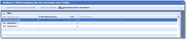 Sie können eine E-Mail-Adresse (E-Mail-Konto) einem oder mehreren Bedienern zuordnen. Über diese Zuordnung wird das Versenden der E-Mails einzelner Bediener gesteuert (Zuordnung E-Mail-Adresse > Absendername).
