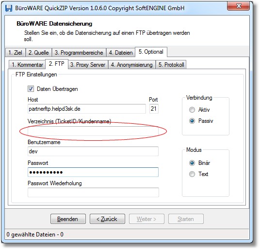 Im Feld VERZEICHNIS (TICKETID/KUNDENNAME) können Sie entweder Ticket-ID oder Kundennummer eintragen und BWQuickzip erstellt dann diesen Ordner auf Ihrer FTP-Cloud. Damit hat der Support sofort darauf Zugriff und dieser neue FTP ist nicht zeitlich begrenzt. Nur wenn die 5GB der FTP-Cloud erschöpft sind, müssen Sie wieder Speicherplatz frei geben.