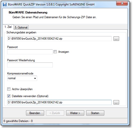 << Hier KLicken um eine Inhaltsübersicht anzuzeigen >> Navigation: Tools > BWQuickZip > Ziel der Datensicherung auswählen |