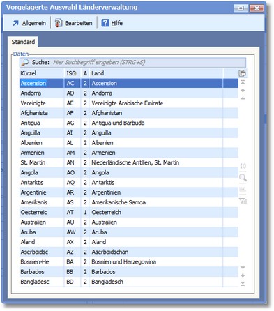 Mit der Länderverwaltung stellt das Programm einen Stammbereich für die Ländertabelle nach dem ISO-ALPHA-II-Code zur Verfügung. Außerdem wird die Speicherung von landesspezifischen Parametern ermöglicht, die bei Zuordnung eines Landes zu einer Adresse in den Kunden- oder Lieferantenstammsatz übernommen werden können. Im Lieferumfang der ERP - Warenwirtschaft befinden sich ca. 200 Länderdaten.