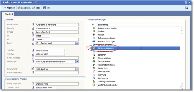 2. Im Bereich "Weitere Einstellungen" doppelklicken Sie nun auf den Eintrag "Lieferbedingungen".
