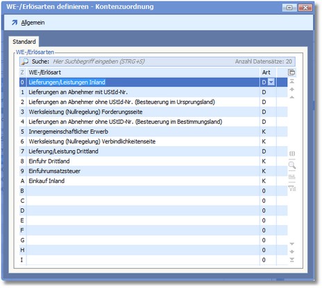 WE-/Erlösarten definieren steuerliche Geschäftsvorfälle, die einer Adresse zugeordnet und im Beleg - falls erforderlich - geändert werden können. Für jede WE-/Erlösart kann in der Kontenzuordnung ein Sachkonto und ein Steuerschlüssel eingetragen werden. Es können insgesamt 20 WE-/Erlösarten verwaltet werden.