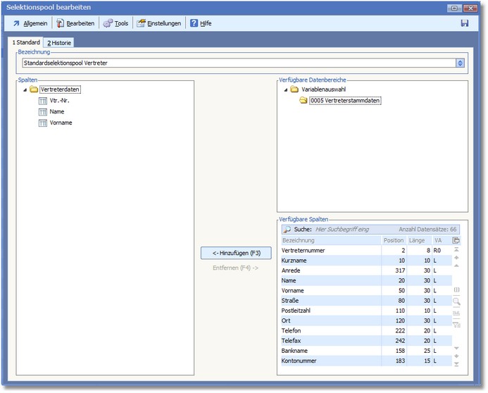 << Hier KLicken um eine Inhaltsübersicht anzuzeigen >> Navigation: Warenwirtschaft > Stammdaten > Vertreter > Selektionspool Vertreterstamm > Selektionspool-Editor |