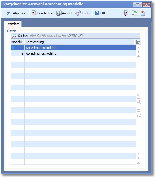 2. Drücken Sie in der vorgelagerten Auswahltabelle der VT-Abrechnungsmodelle die Funktionstaste [F3] oder wählen Sie den Menüeintrag "Allgemein > Neues Abrechnungsmodell".