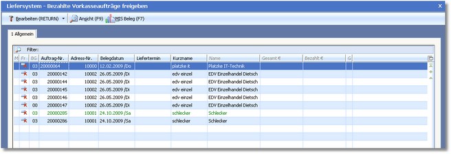 Das Programm öffnet den Dialog "Liefersystem - Bezahlte Vorkasseaufträge freigeben".