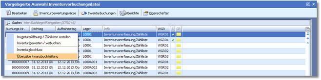 1. In der vorgelagerten Auswahl Inventurvorbuchungsdatei klicken Sie im Kontextmenü der rechten Maustaste auf den Menüpunkt "Übergabe Finanzbuchhaltung".