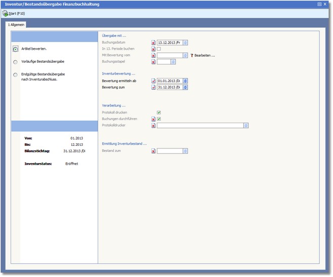 Das Programm öffnet das Dialogfenster "Inventur/Bestandsübergabe Finanzbuchhaltung".