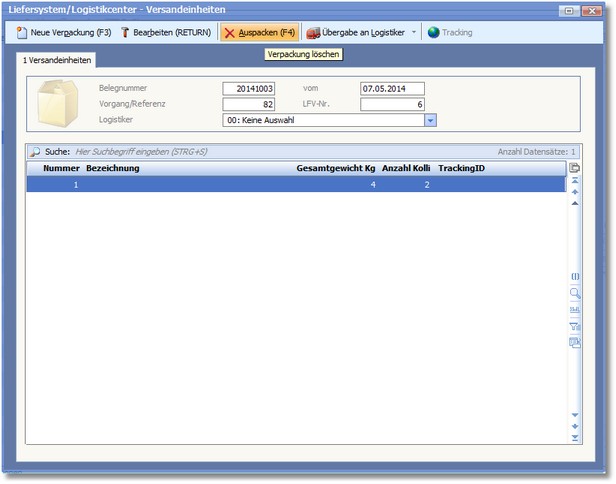 Mit [F4] oder Klick auf den Symbolbutton <Auspacken> kann eine gewählte Verpackung gelöscht werden.